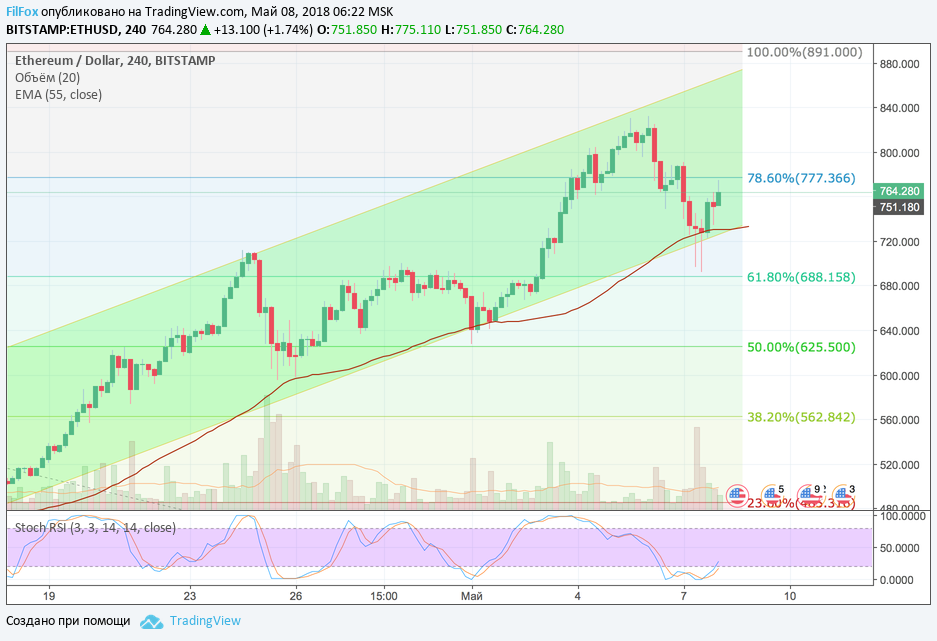Вчера цена Ethereum пыталась ре-тестить уровень поддержки 61.8% фибо (688.15 USD), но встретила поддержку в районе скользящей средней EMA55, которая на четырёхчасовом тайм-фрэйме, проходит в области цен 720.00 долларов за эфир. Цена смогла развернуться и восстановилась до уровня цен 6 мая, когда быки и медведи боролись за уровень 78.6 фибо (777.36 USD). Полагаем, что сегодня цена опять попытается немного консолидироваться на этом уровне.