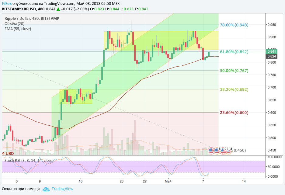 Цена Ripple вчера отправилась тестировать уровень поддержки 50% фибо (0.767 USD), но по пути встретила поддержку в области средних цен (0.800 USD), которая отображается в виде кривой EMA55 на восьмичасовом тайм-фрэйме. В точке минимума, индикатор стохастик дал сигнал на покупки. Полагаем, что рост цены рипл продолжится до уровня желтого коридора, в котором цена долгое время находилась в боковике.