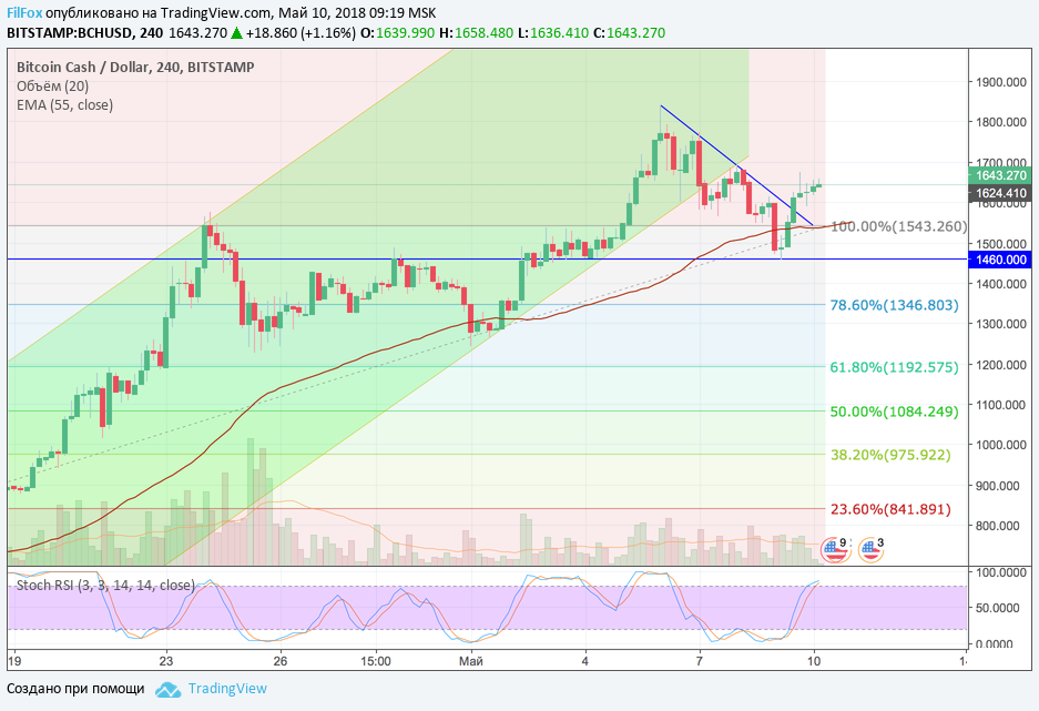 Если сегодня объём торгов по BCH будет таким же малым, как и вчера, то наиболее вероятно, что цена будет двигаться вбок, используя поддержку сразу двух уровней 100% фибо (1543.26 USD) и средних цен EMA55.