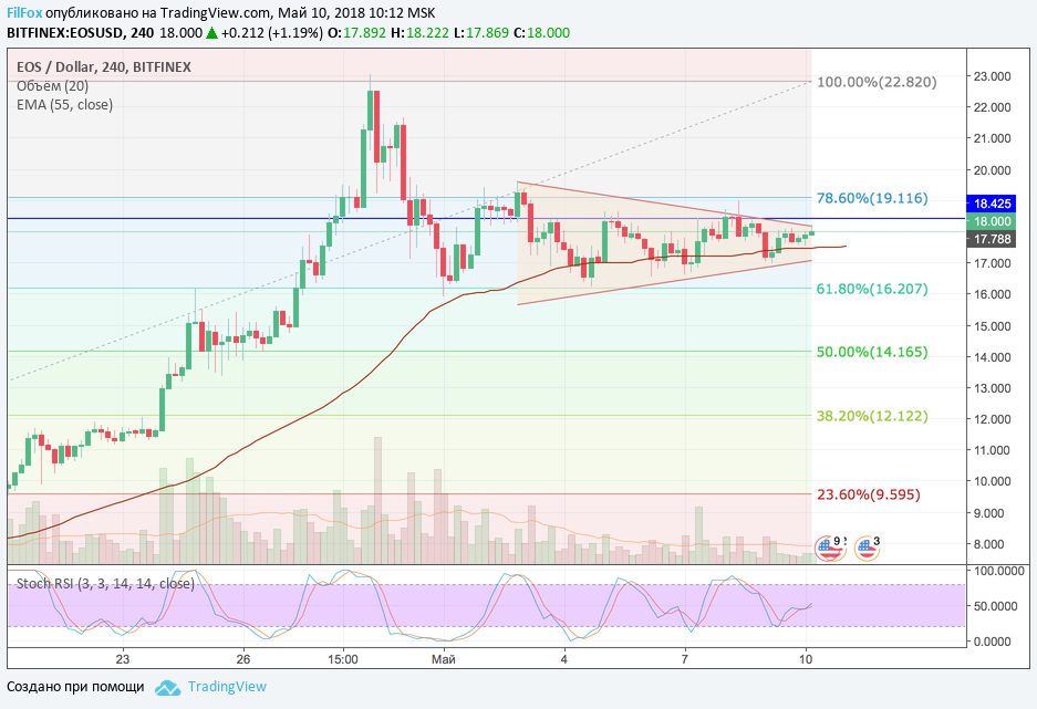 Торговля по EOS проходила вчера на очень маленьких объёмах и цена продолжала сужать амплитуду боковика. Наш прогноз, по прежнему остаётся медвежий. Полагаем, что первый импульс, который выбьет цену из сужающегося диапазона, будет направлен в продолжение отката от абсолютного максимума, установленного 29 апреля на отметке 22.82 USD. Падение цены может притормозить уровень 50% фибо (14.16 USD)