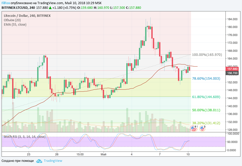 Сегодня движение пары LTC/USD будет проходить в боковом диапазоне между уровнем поддержки 78.6% фибо (154.00 USD) и сопротивления, в виде скользящей средней EMA55 (160.00 USD).