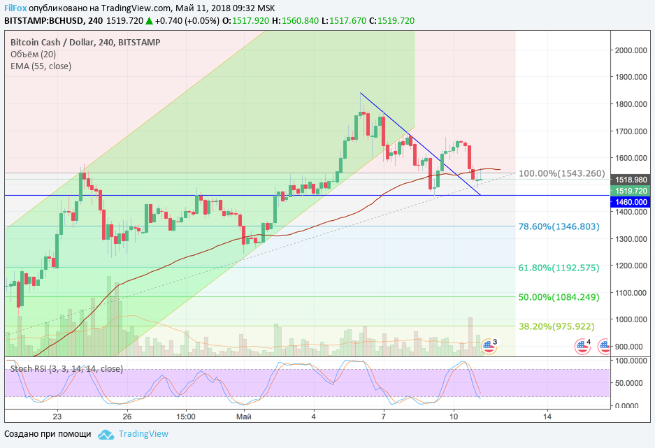 Двухуровневая защита от падения не выдержала медвежий натиск, и вчера цена Bitcoin Cash провалилась под 100% уровень фибоначчи (1543.26 USD) и кривую EMA55, которая проходила в этом же районе. Это произошло после того, как стохастик в зоне перекупленности «нарисовал» сигнал на продажи.