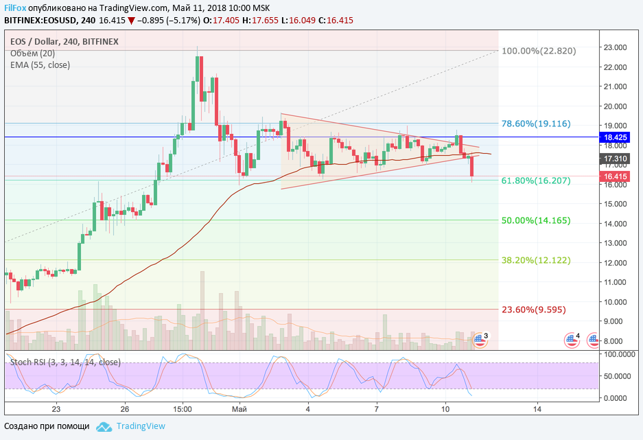 В действительности наши ожидания подтвердились сегодня, в виде сильного медвежьего импульса, который пробил нижнюю границу диапазона консолидации и отправил цену EOS к уровню 50% фибо (14.16 USD). Вполне вероятно, что падение на этом уровне немного замедлится, но в ближайшей перспективе пара EOS/USD может достигнуть уровня 11.44 USD.