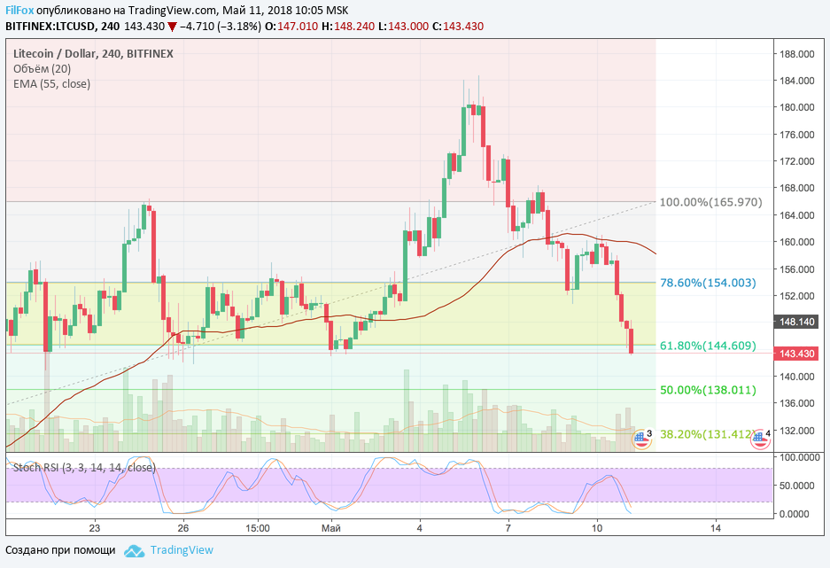 Полагаем, что сегодняшнее снижение цены LTC ограничится уровнем поддержки 61.8% фибо (144.00 USD). Наиболее вероятный коридор для консолидации цены, на наш взгляд, по прежнему, считаем желтый диапазон. В области 140.00 долларов за Litecoin просматривается уровень поддержки, который способен вернуть пару в желтый коридор цен.