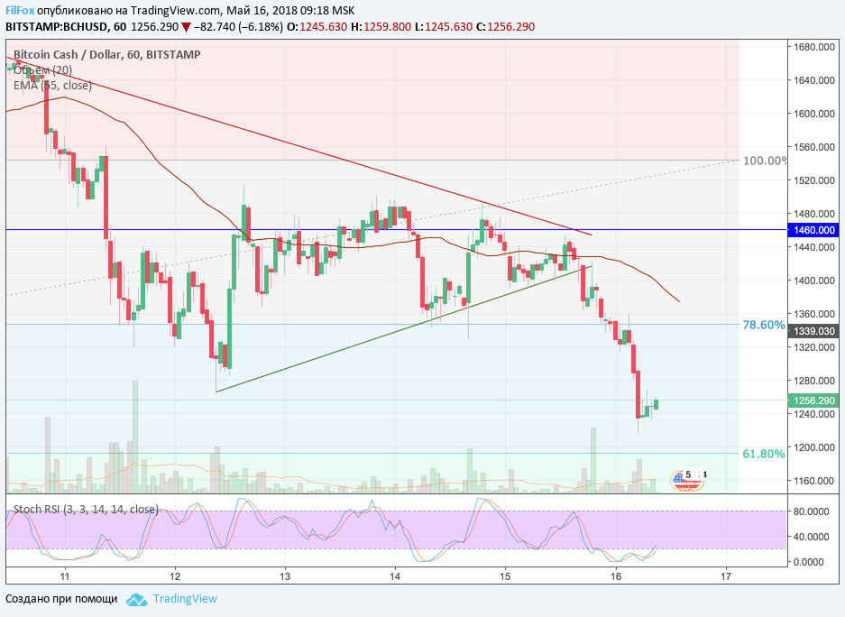Но сегодня утром давление на цену усилилось и всё шло к тому, что пара BCH/USD могла бы протестировала 61.8% фибоначчи (1192.57 USD). Однако в точке минимума 1215.00 USD Bitcoin Cash приостановил снижение. Получен сигнал стохастика на рост цены. Полагаем, что пара восстановится до утреннего уровня цен, в область 78.6% фибо (1346.80 USD).