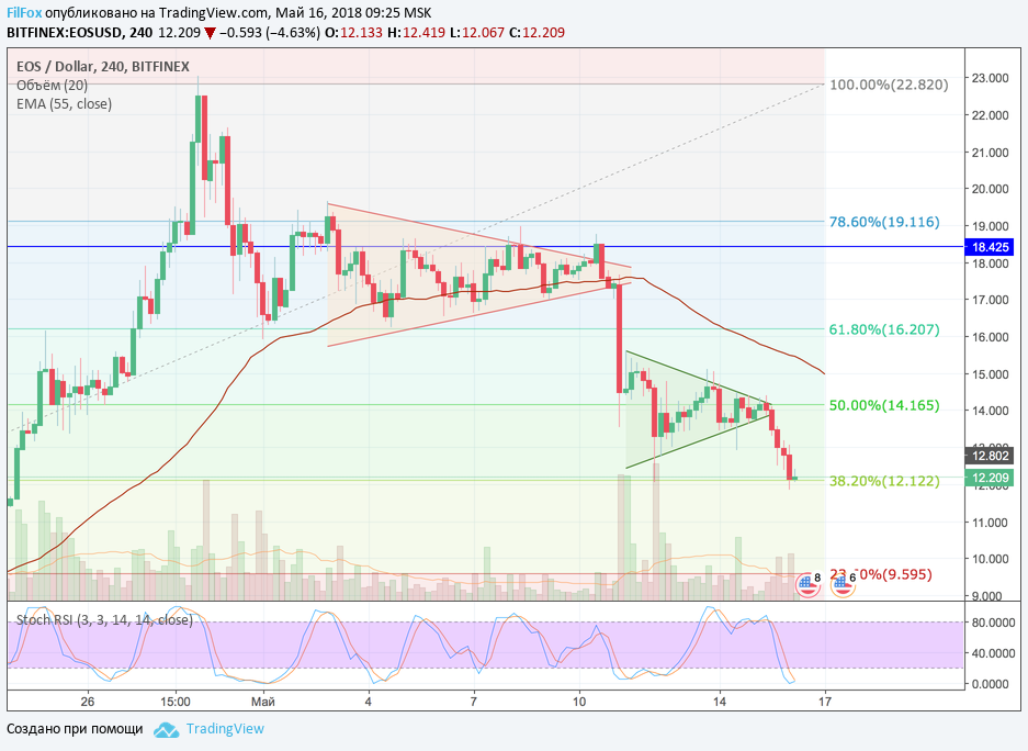 Вчера, заметив формирующийся сигнал стохастика на продажу, трейдеры открыли короткие позиции по токену EOS, в результате цена пробила нижнюю границу сужающегося диапазона и сегодня утром протестировала поддержку 38.2% фибо (12.12 USD). Полагаем, что сегодня цена сможет консолидироваться над этим уровнем фибоначчи. Но хватит ли сил у покупателей восстановить цену до вчерашнего уровня 50% фибо (14.16 USD)? Судя по последним объёмам покупок, цена может откатиться только в область 13.50 USD.