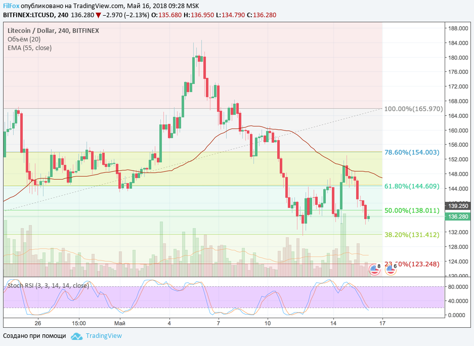 Litecoin вчера не смог пробить уровень средних цен 148.00 USD. После нескольких ре-тестов скользящей средней EMA55 (148.00 USD), цена на снижении прорвала уровень 50% фибо (138.00 USD), направляясь к 38.2% фибо (131.00 USD). Однако, сегодня возле точки минимума 134. USD падание существенно замедлилось, и цена пытается восстановиться к пятидесятипроцентному уровню фибоначчи. Возможно это и сработает, но чуть позже цена LTC всё-таки протестирует намеченный 38.2% фибо (131.00 USD)