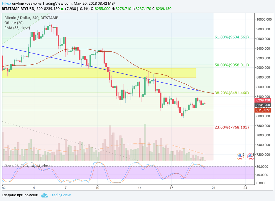 Сильная волатильность, которая проявлялась в начале текущей недели постепенно затихла, и сегодня мы можем наблюдать некоторую устойчивость рынка, в частности пара BTC/USD большую часть недели консолидируется возле силового уровня 8118.58 USD. Амплитуду консолидации нельзя назвать «затухающей», но в течение недели цена несколько раз тестировала этот силовой уровень. При очередном снижении ожидается повторный прорыв этого уровня сопротивления и попытка удержаться в боковике, сразу под линией 8118.58 USD, с последующим тестом уровня фибоначчи 23.6% (7768.00 USD).