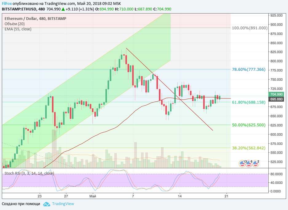 19 мая курс Ethereum вновь восстановился к среднему уровню цен и сегодня закрепился чуть выше 61.8% фибо (688.16 USD).