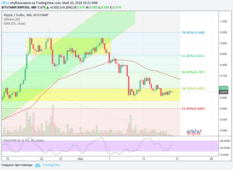 Сегодня цена продолжает консолидироваться в желтом диапазоне цен, верхняя граница которого находится, примерно на уровне 38.2% фибо (0.692 USD). Полагаем, что перед очередным снижением, рипл попытается пробить этот уровень сопротивления. Очередной целевой уровень снижения - это поддержка на 23.6% фибо (0.600 USD)