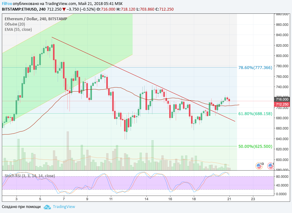 Цена Ethereum, в воскресенье, после ре-теста красной даун-трендовой линии, восстановилась выше уровня средних цен и установила воскресный максимум на отметке 723.00 USD. Стохастик в зоне перекупленности даёт сигнал на продажи. Цена эфира постепенно возвращается к уровню средних цен, обозначенному скользящей средней EMA55. Сегодня вполне возможно, что этот уровень окажет поддержку эфиру и цена «зависнет» в этой области.