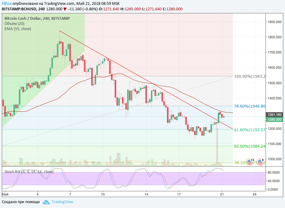 Пара BCH/USD продолжила рост, на средних объёмах, пробив сопротивление красной линии нисходящего тренда, пока не встретила сопротивление скользящей средней EMA55.