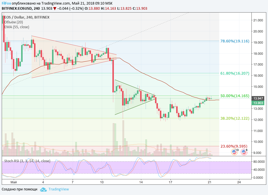 Вчера, в области цен 13.00 USD, восстановление цены на токен EOS не «затухло», а наоборот продолжилось до уровня средних цен. Пара EOS/USD смогла закрепиться выше уровня скользящей средней EMA55, но преодолеть сопротивление 50% фибо (14.16 USD) не удалось. Сигнал стохастика на снижение, в зоне перекупленности, пока не сформирован и говорить о сегодняшнем падении пары EOS/USD пока рано. Возможно днём цена немного консолидируется возле пятидесятипроцентного уровня фибоначчи.