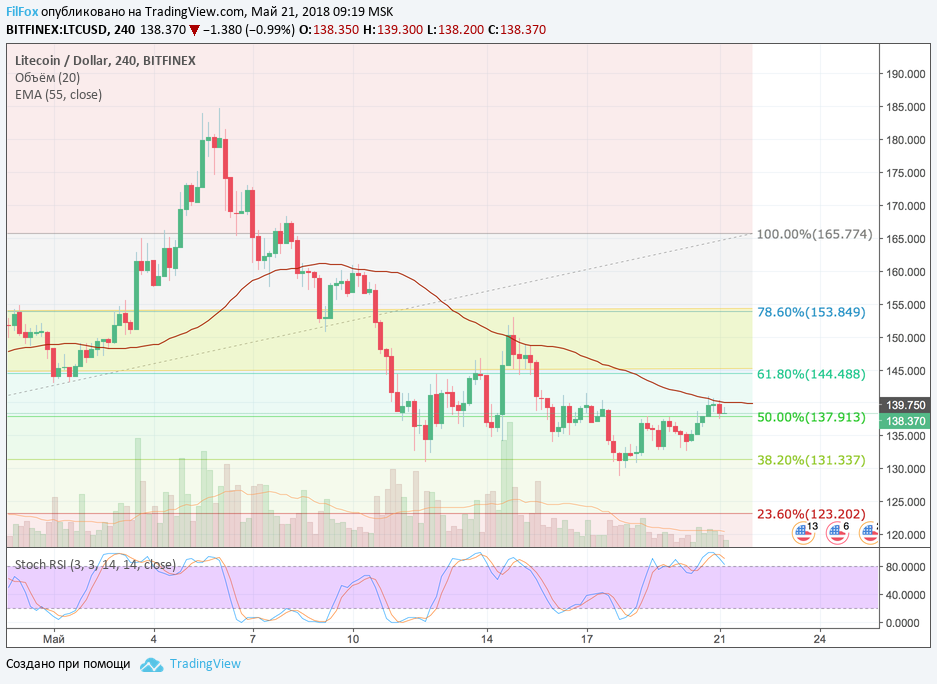В воскресенье Litecoin преодолел сопротивления 50% фибо (137.97 USD) и восстановился до уровня средних цен. Сопротивление скользящей средней EMA55 ещё не преодолено. Уровень 50% фибо пока поддерживает цену на этом уровне, даже несмотря на сигнал стохастика на снижение. И всё же прорыв этого уровня сегодня выглядит более вероятней.
