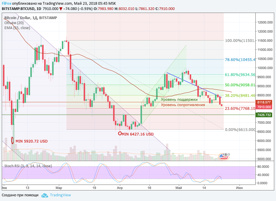 22 мая, когда всё прогрессивное человечество было занято поеданием пиццы и празднованием Bitcoin Pizza Day, сам виновник торжества (я сейчас не имею ввиду Ласло Ханич), в течение дня упал почти на 5%. Цена Bitcoin пробила сильный уровень поддержки 8118.58 USD и приостановила падение только в районе цен 7900.00 USD, сократив стоимость пиццы до 39.5 млн. долларов США.
