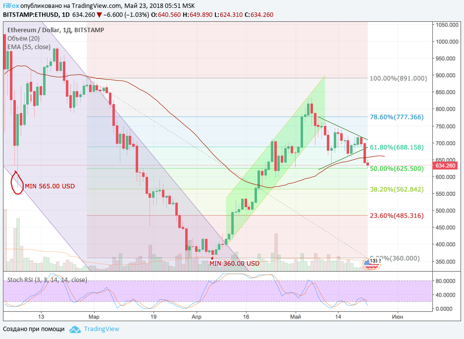 Как и предполагалось, выход из паттерна «Вымпел» был в виде сильного медвежьего импульса, который пробил нижнюю границу фигуры и замедлил падение только после ре-теста 50% уровня фибо (625.50 USD). Сегодня падение эфира продолжится, но к концу дня цена вновь восстановится к 50% фибо (625.50 USD).