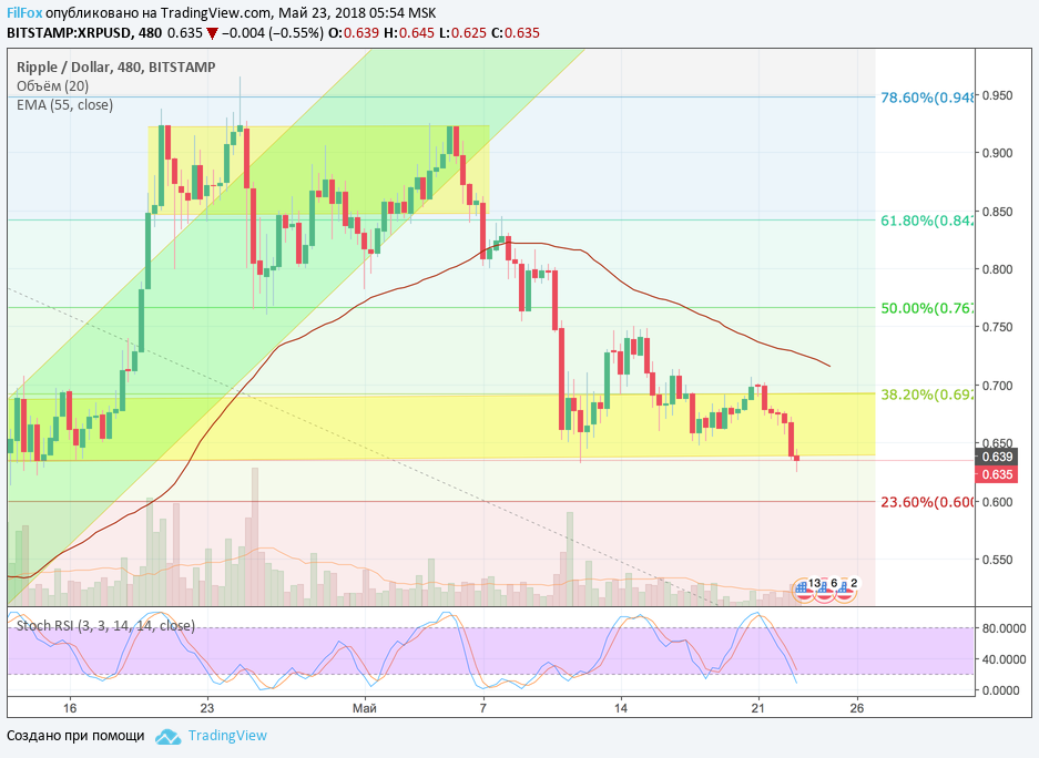 Ripple вчера протестировал нижнюю границу желтого диапазона, а сегодня пробил её, направившись к очередной поддержке 23.6% фибо (0.600 USD). Полагаем, что в результате восстановления цена рипл вернётся ненадолго в границы желтого коридора.