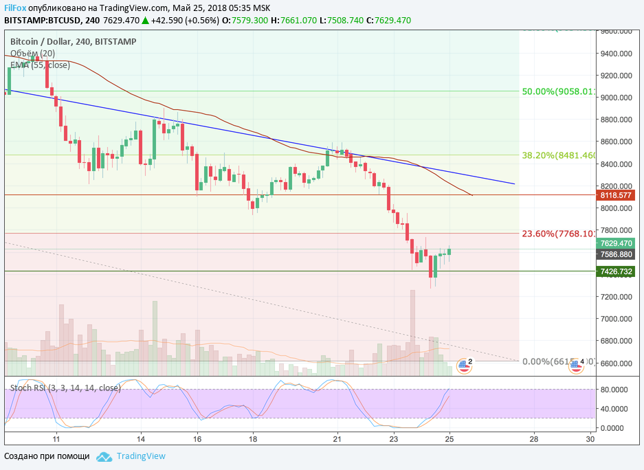 Вчера цена Bitcoin, на восстановлении, пыталась протестировать уровень сопротивления 23.6% фибо (7768.10 USD). Неожиданно, ещё не завершив фазу восстановления, цена резко развернулась на дневном максимуме (7733.99 USD) и упала ниже уровня поддержки 7426.00 USD, остановившись только в точке 7267.00 USD.