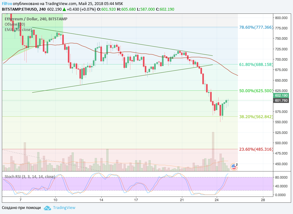 Аналогичная динамика восстановления, с неожиданным медвежьим импульсом, прослеживается и на графике Ethereum. Прервав восстановление пары ETH/USD, цена резко пробила уровень поддержки 38.2% фибо (562.84 USD) и установив дневной минимум на отметке 549.88 USD, продолжила фазу восстановления.