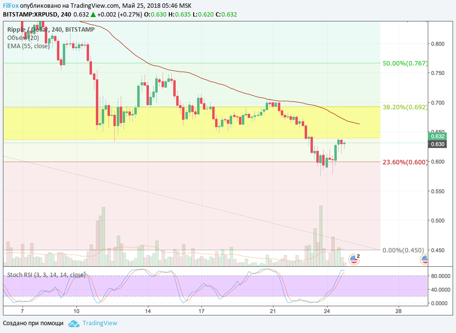 Ripple после вчерашнего медвежьего импульса консолидировался на уровне поддержки 23.6% фибо (0.600 USD), но потом продолжил восстанавливаться и протестировал нижнюю границу желтого коридора. Похоже на этом восстановление рипл закончилось, индикатор стохастик даёт сигнал на продажи. Цена рипл в начале очередного снижения.