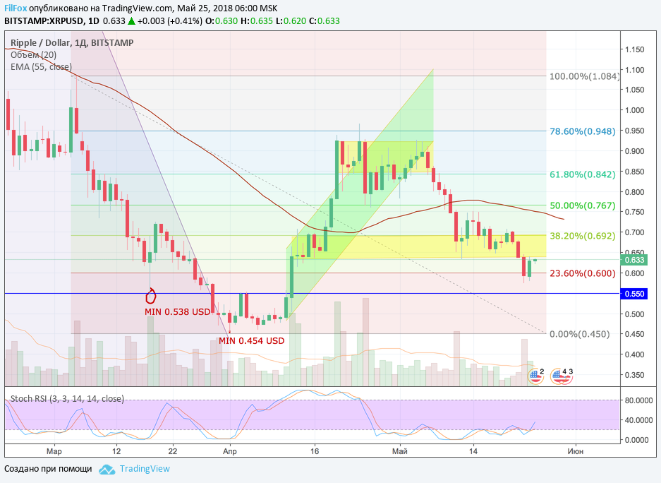 Судя по графику, существует линия поддержки, на отметкке 0.550 USD. Полагаем, что в этой области падение XRP замедлится.