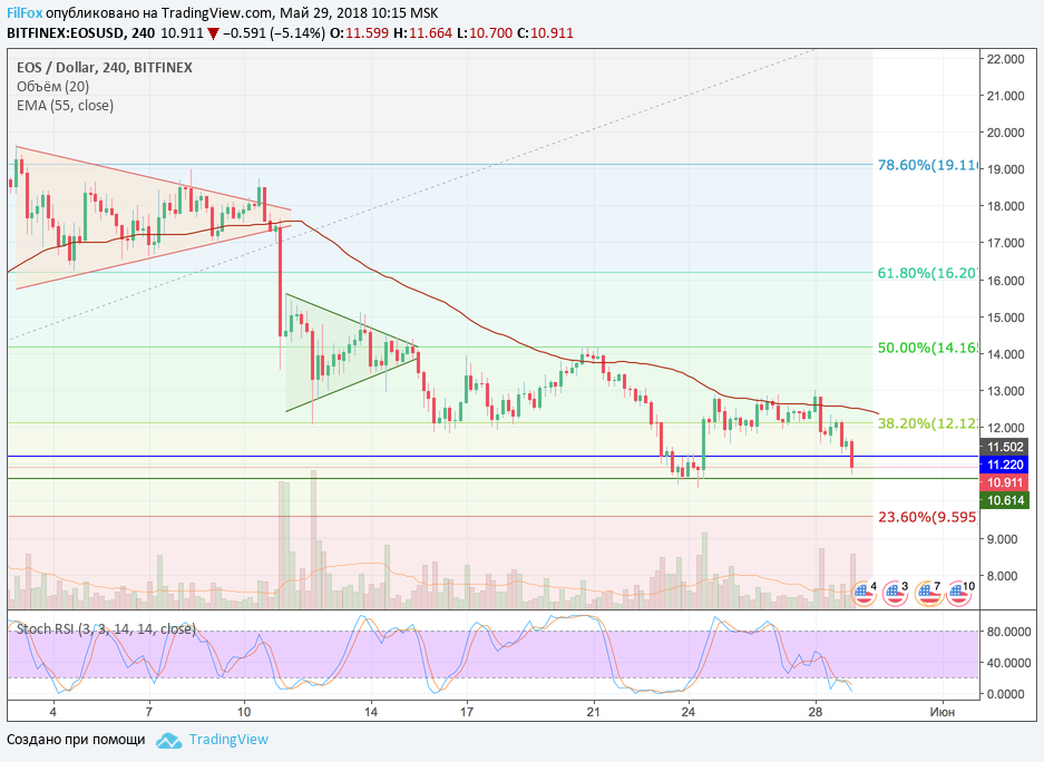 После консолидации в области средних цен, пара EOS/USD пробила поддержку уровня 38.2% фибо (12.12 USD) и в падении смогла зацепится за поддержку на уровне 11.22 USD, предварительно отметившись на локальном минимуме - 10.70 USD. Судя по показаниям стохастика, который находится в зоне перепроданности, падать ниже зеленой отметки на 10.614 USD не входит в планы EOS. По крайней мере сегодня. А это значит, что время для покупок ещё не настало.