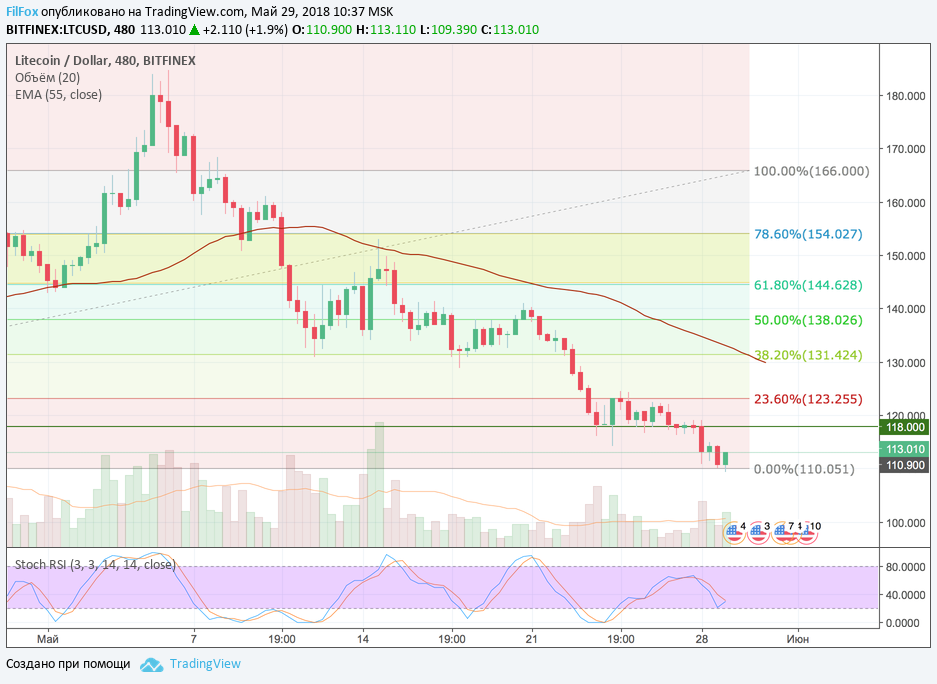 Litecoin вчера честно пытался удержаться на отметке 112.00 USD, но в итоге сдался и проколол нулевой уровень фибоначчи (110.00 USD), установив минимум на отметке 109.00 USD. Сегодня цена немного восстановилась к «честному» уровню 112.00 USD и пытается закрепится на нём. Начавшееся восстановление может вернуть цену к воскресному уровню консолидации - 118.00 USD.