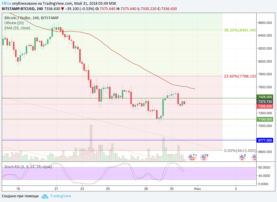 Но существует вероятность пробоя уровня фибоначчи 23.6% (7768.10 USD) и закрепление цены выше этого уровня сопротивления, на увеличенных объёмах торгов. Если такое произойдёт, то даун-тренд может развернуться. Если ничего подобного не случится, то будет продолжение нисходящего тренда.