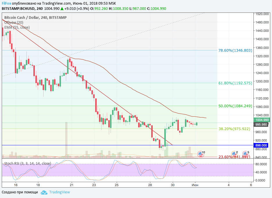 Bitcoin Cash вчера смог удержаться в боковике, над уровнем поддержки 38.2% фибо (975.92 USD). Стохастик покинул зону перекупленности и на отметке 50% сформировал сигнал о возможном росте. Насколько он будет интенсивный - пока судить сложно, возможно пара сумеет вернуться на уровень прошлой пятницы и протестировать 50% фибо (1084.00 USD)