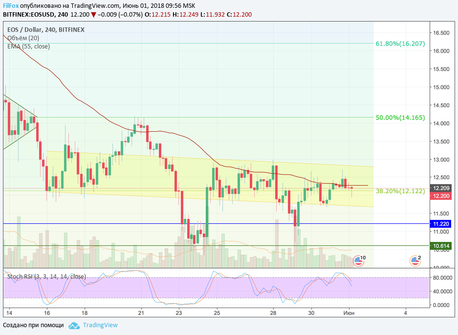 Весь вчерашний день EOS провел в желтой зоне консолидации, на линии скользящей средней EMA55. Сегодня, EOS, в ожидании перехода в свою собственную сеть, продолжит движение в боковом направлении, в рамках желтого коридора консолидации. Если завтра переход пройдёт без сбоев, то цена EOS сможет продолжить рост.