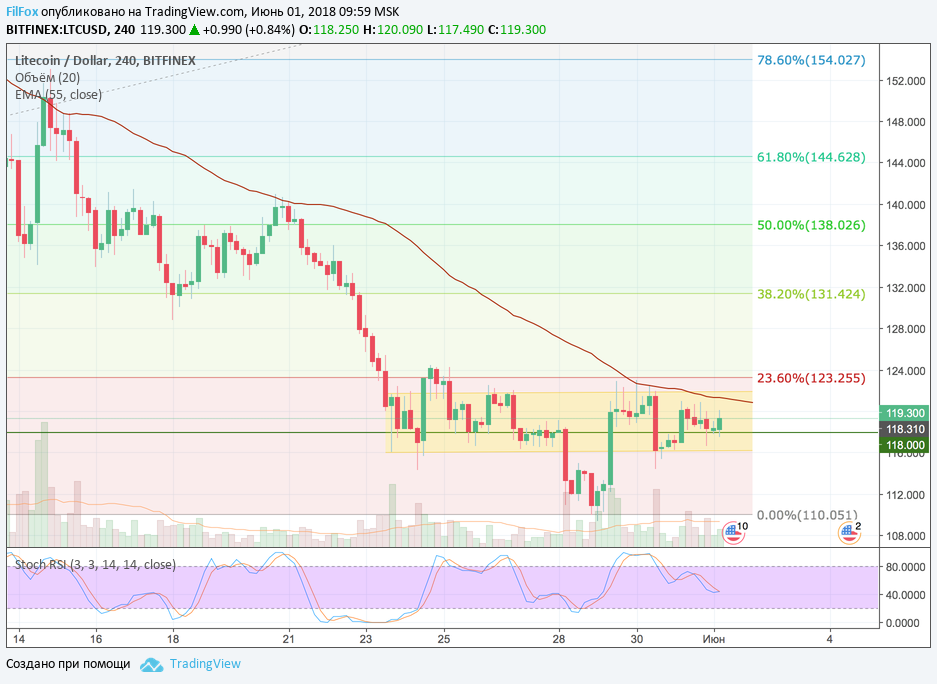 Пока рынок не определился с дальнейшим трендом, Litecoin тоже будет лежать во флэте, в диапазоне желтого коридора, консолидируясь вдоль линии 118.00 USD. Стохастик в нейтральной зоне указывает на предстоящий рост пары, но полагаем, он будет ограничен границами желтого диапазона. Если цена сможет пробить его верхнюю границу, то уровень сопротивления 23.6% фибо вернёт её в пределы коридора.