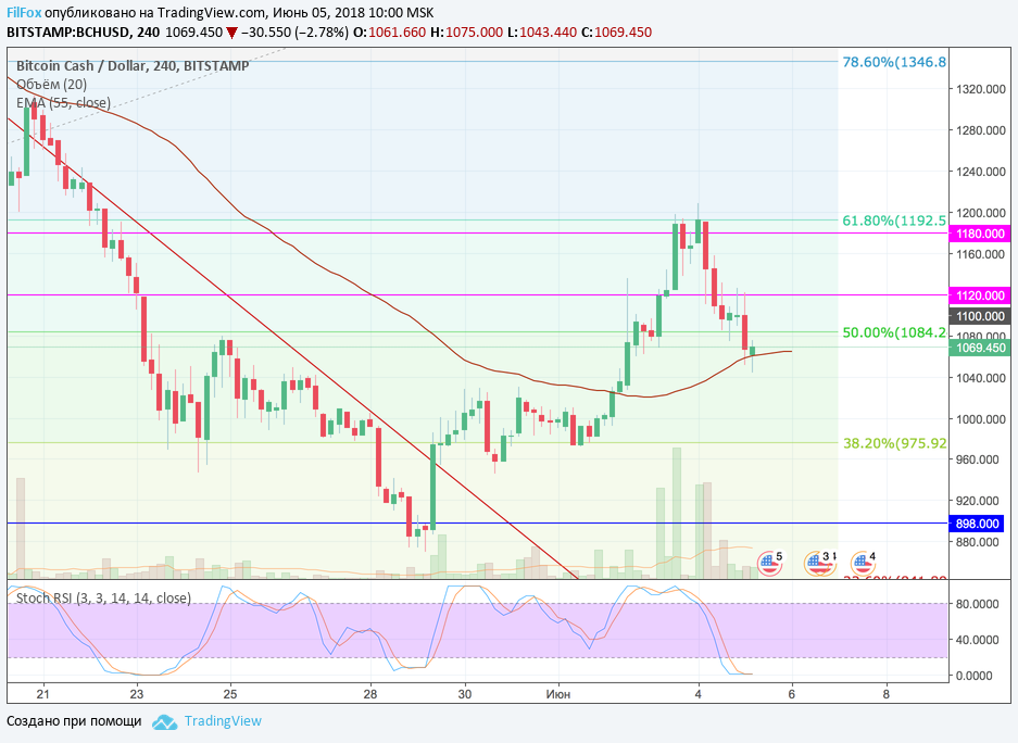 Вчера цена Bitcoin Cash пробила поддержку 50% фибо (1084.00 USD) и протестировала уровень средних цен на четырёхчасовом графике. Скользящая средняя удержала пару от продолжительного снижения и скорее всего направит её обратно, к пятидесятипроцентному уровню фибоначчи. После консолидации на этом уровне, пара возобновит падение к ближайшей целевой отметке на уровне 38.2% фибо (975.92 USD).