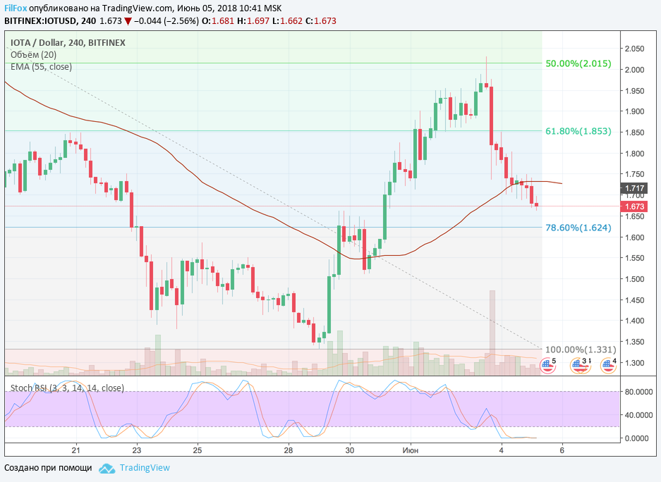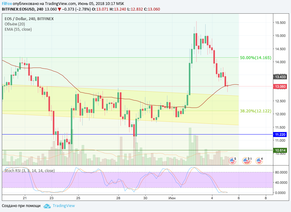 Наши ожидания по EOS оправдались. Цена снижается к верхней границе желтого коридора, на уровне 12.73 USD. Сегодня установлен локальный минимум на отметке 12.83 USD, но цене удалось зацепиться за скользящую среднюю EMA55, на уровне 13.10 и пара пытается шагнуть вбок. Полагаем, что отдохнуть в боковике она сможет только в желтом коридоре, потому что давление на EOS ослабло не надолго.