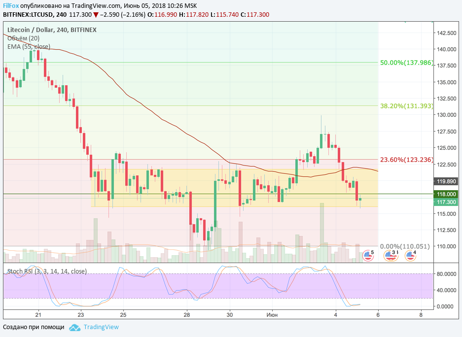 Вчера, в падении, Litecoin протестировал нижнюю границу желтого коридора, в котором наибольшая концентрация торговых ордеров. Вероятно, что пара некоторое время будет консолидироваться в этом диапазоне, в районе зеленой линии 118.00 USD. Однако после консолидации падение возобновится к нулевому уровню фибоначии 110.00 USD.