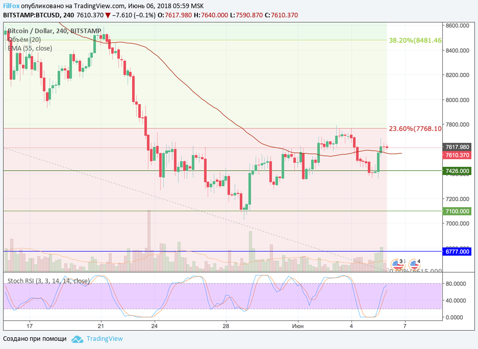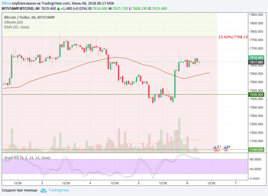 Если взглянуть на часовой график, то можно увидеть, как пара уже десять часов «залипла» вдоль линии 7618.00 USD. Что это? Неужели подготовка к прыжку выше уровня 23.6% фибо (7768.00 USD)? (На восьмичасовом тайм-фрэйме стохастик показал сигнал роста.) Если произойдёт чудо и цена пробьёт сопротивление 23.6 фибо, закрепившись выше этого уровня, то рост мог бы продолжиться в среднесрочной перспективе.