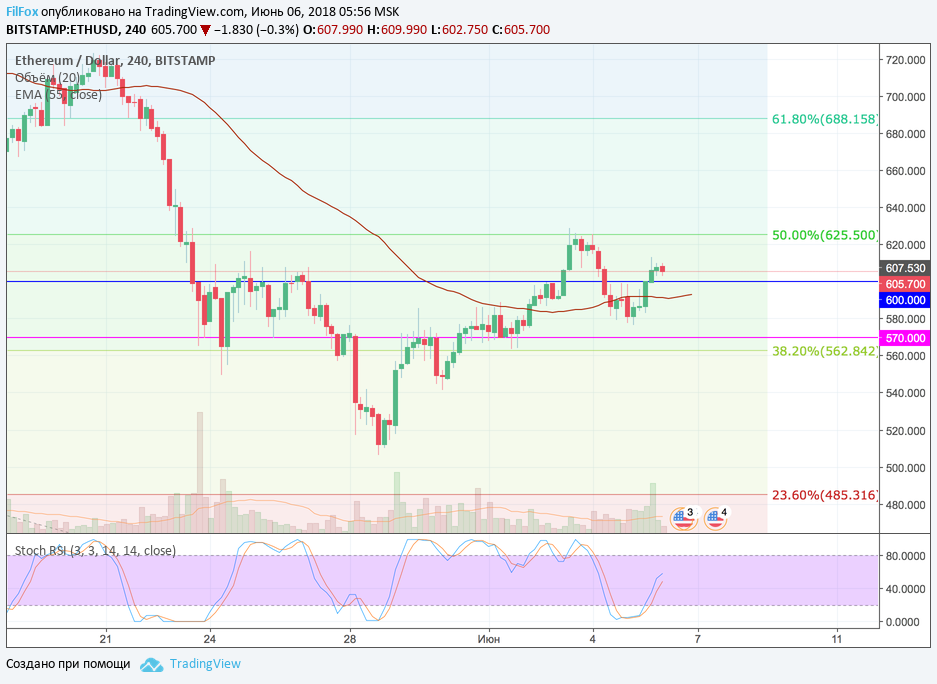 Неожиданно преждевременно развернулась на минимуме 576.00 USD цена пары ETH/USD, так и не протестировав поддержку 570.00 USD, которую мы нарисовали во вчерашнем прогнозе. Ethereum смог восстановится выше психологического уровня 600.00 долларов за эфир и теперь, затухающими колебаниями возле отметки 606.00 USD, пытается подготовиться к импульсу.