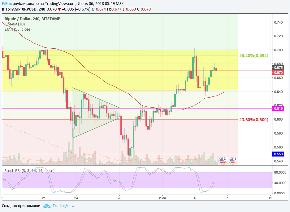 Нижняя граница желтого коридора не выпустила Ripple за пределы диапазона консолидации и цена пары XRP/USD находится на распутье, ровно посредине коридора боковика, в ожидании команды «сверху». Какова будет сегодня динамика Bitcoin, туда и последует вся основная масса альткоинов. Наиболее вероятным сценарием считается снижение к нижней границе желтого диапазона и прорыв к целевой отметке 0.616 USD.