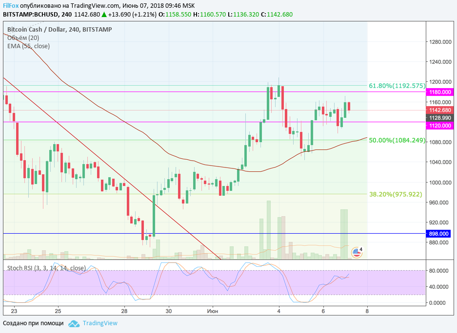 Вчера цена Bitcoin Cash пыталась напугать игроков рынка своим снижением и пробила поддержку 1120.00 USD. Но в точке минимума $1097.00, BCH начали выкупать просто огромными объёмами и цена восстановилась на прежний уровень. Сегодня покупки продолжались, пока не достигли дневного максимума на отметке 1171.00 USD. Грубо говоря, пара продолжает боковик, немного увеличив границы диапазона.