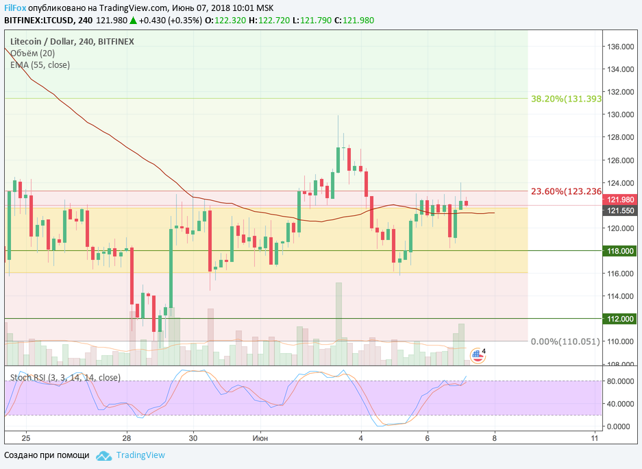 Идилия вчерашней консолидация между EMA55 и 23.6% фибо (123.00 USD) была грубо нарушена «провалом» в область 118.00 USD. Однако довольно быстро цена пары LTC/USD вернулась в исходную позицию, продолжив боковик. Сегодняшний день начался с максимума 124.00 USD, но продолжение флэта ожидается под уровнем сопротивления 23.6% фибо (123.00 USD), вдоль верхней границы желтого коридора. При позитивном настроении рынка ждём пробоя уровня этого уровня сопротивления и ре-тест 38.2% фибо (131.00 USD). При негативной динамике пары BTC/USD - остаётся актуальным наш вчерашний сценарий с продолжением нисходящего тренда и ре-теста нулевого уровня фибоначчи.