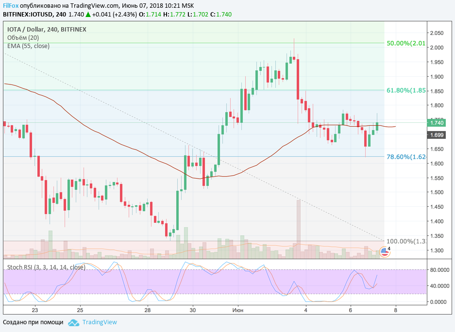 Вчера на снижении IOTA протестировала уровень 78.6% фибо (1.62 USD), но довольно быстро вернулась в область средних цен, предварительно очертив дневной максимум на уровне 1.77 USD. Полагаем, что сегодня IOTA, как и все остальные альткоины, будут находится в боковике, до получения внятного сигнала по тренду.