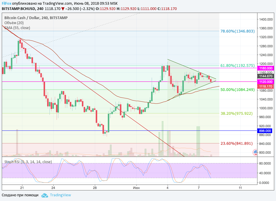 Посе того, как пара BCH/USD немного расширила границы боковика, на четырёхчасовом тайм-фрейме появилась возможность рассмотреть паттерн «Вымпел». Как правило, Вымпел - это фигура продолжения тренда. До вымпела Bitcoin Cash фиксировал возрастающие максимумы. Поэтому вполне вероятен бычий импульс с прорывом уровня сопротивления 61.8% фибо (1192.57 USD). Целевая отметка при таком прорыве будет находится на уровне 1320.00 USD.