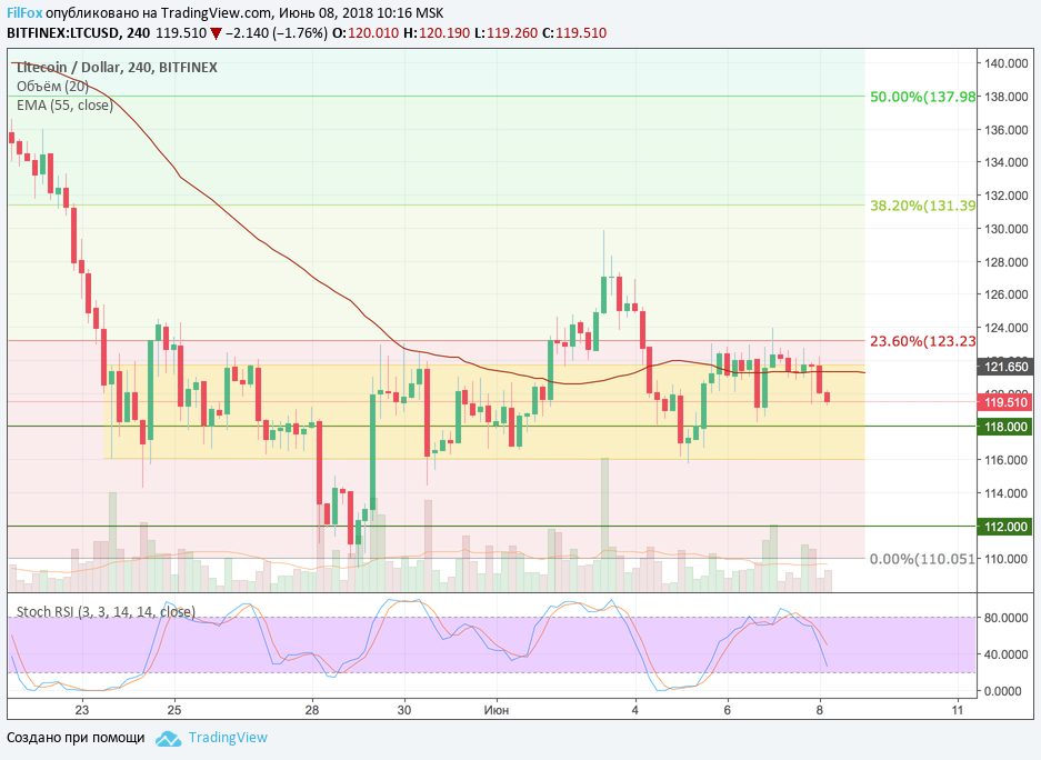 Litecoin сегодня пробил уровень поддержки в виде скользящей средней EMA55 и направился тестировать нижнюю границу желтого коридора. Если уровень поддержки 118.00 USD не приостановит падение, то и граница желтого диапазона тоже может быть пробита.