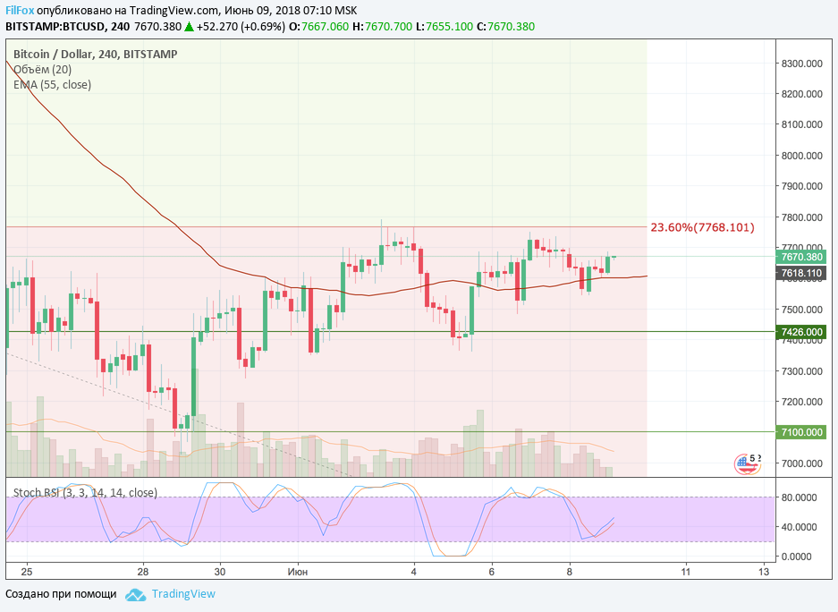 Похоже, что пара хочет использовать третью попытку прорыва ключевого уровня сопротивления 23.6% фибо (7768.00 USD). Помним, что для среднесрочного роста обычного ре-теста этого уровня - не достаточно. Цена обязательно должна закрепиться выше. Если на выходных третья попытка потерпит фиаско, полагаем, что четвёртой попытки может уже не быть. Консолидация закончится резким снижением, о котором мы говорили во вчерашнем прогнозе.