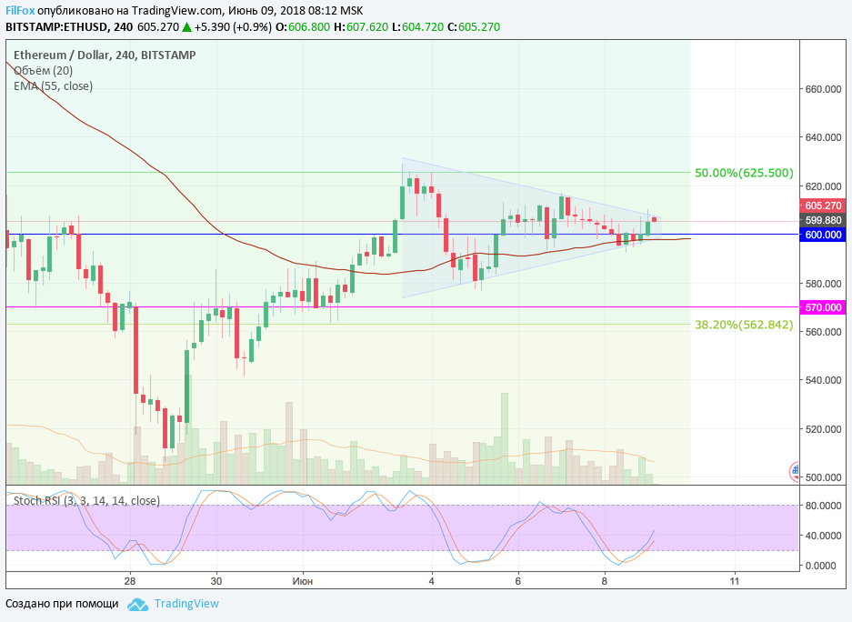 Не вышел из стадии консолидации и Ethereum. Вчера, в течение дня, цена на эфир снижалась к психологической отметке 600.00 USD, пока не встретила поддержку уровня средних цен EMA55. Установив минимум 592.00 USD, цена постепенно смогла закрепиться выше психологического уровня. В точке минимума стохастик сформировал сигнал на рост и сегодня пара уже тестирует верхнюю границу паттерна Вымпел.
