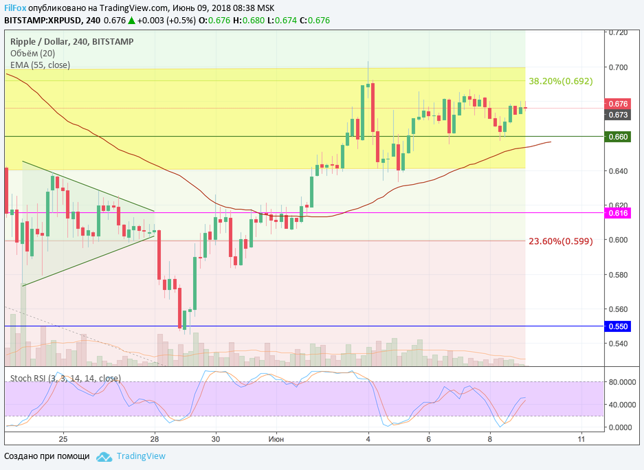 Внутри желтого диапазона консолидации пары XRP/USD определённо существует какая-то поддержка на уровне 0.660 USD. На вчерашнем снижении к нижней границе диапазона, цена Ripple даже не достигла уровня скользящей средней, а развернулась в области этой поддержки. Сейчас пара продолжает консолидацию в желтом коридоре и выход из диапазона будет, конечно же, связан с успехами пары BTC/USD.