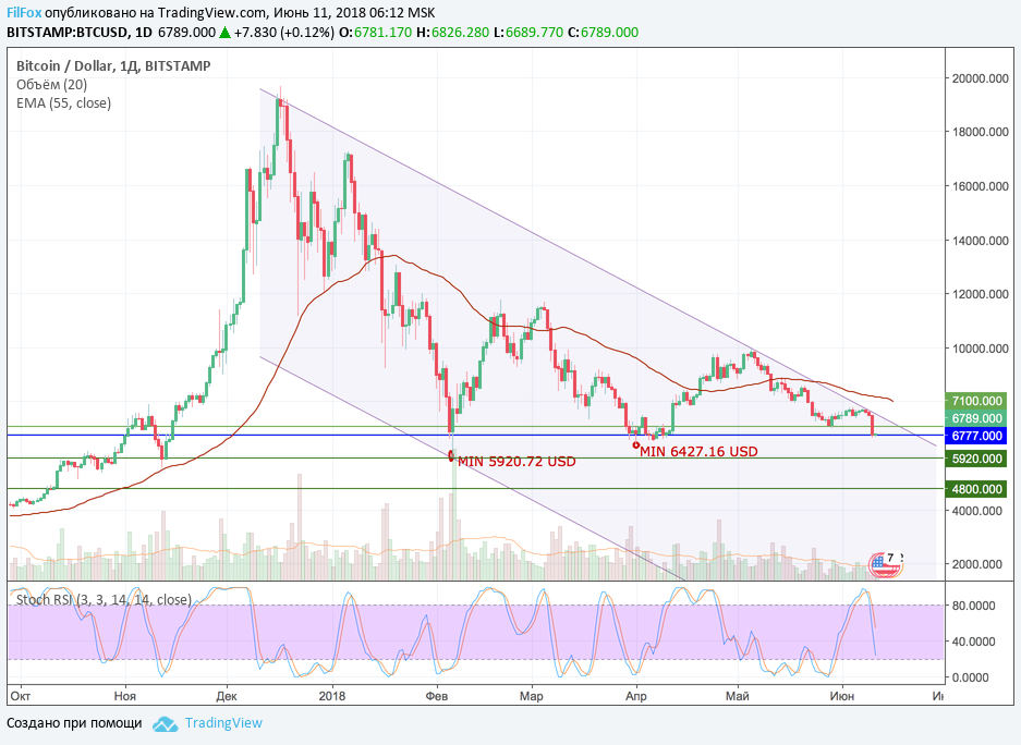 Для того, чтобы определить очередные уровни поддержки, необходимо перейти на более крупный тайм-фрэйм. На дневном графике мы видим, что последний минимум был установлен 1 апреля 2018 года на отметке 6427.18 USD. А разворотный уровень находится на нулевом уровне фибоначчи 6615.00 USD. Полагаем, что после возобновления снижения этот уровень будет преодолён.