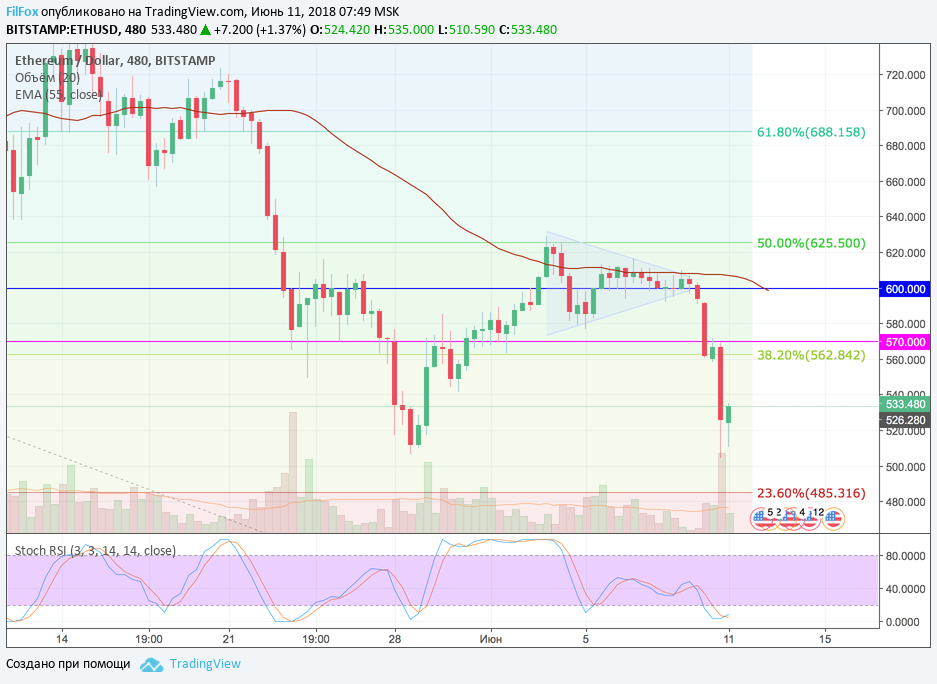 Ethereum вчера пробил уровень 570.00 USD и пытался зацепиться за поддержку 38.2% фибо (562.84 USD). Но закрепиться выше этой поддержки уже не удалось, так как рубеж 570.00 USD сработал как сопротивление. Со второй попытки цена пробила поддержку и установила дневной минимум, вблизи психологического уровня «500 долларов за эфир», на отметке 504.00 USD.