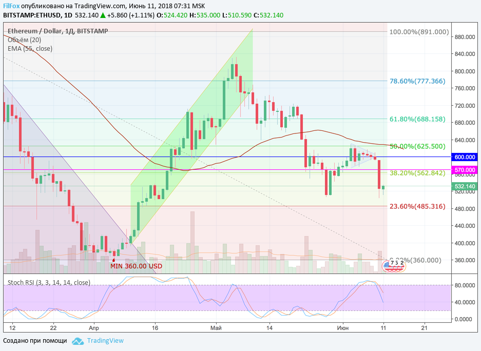 Сейчас пара откатилась в область 530.00 USD. На этом уровне эфир консолидировался 28 мая, после минимума 517.00 USD. Полагаем, что после небольшого отката, цена, как и в мае, просядет ниже. В нашем случае, скорее всего, это будет поддержка 23.6% фибо (485.31 USD).