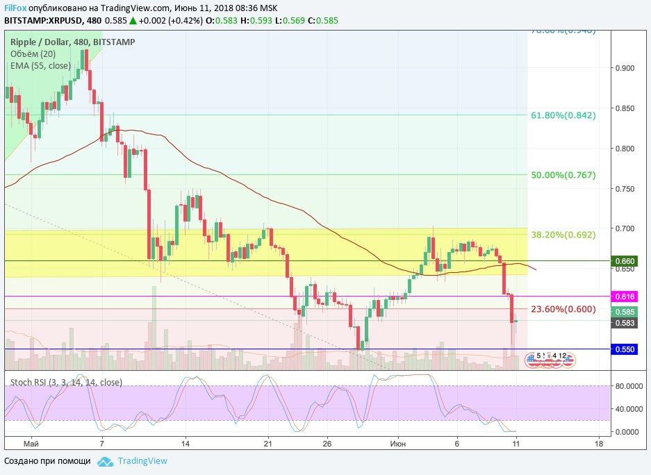 Ripple вчера пробил поддержку 23.6% фибо (0.600 USD) и чуть-чуть не добрался до целевого уровня 0.550 USD, установив минимум в красивой точке 0.555 USD. Сейчас цена отскочила в область 0.580 долларов за рипл и готовится к ре-тесту целевого уровня 0.550 USD.