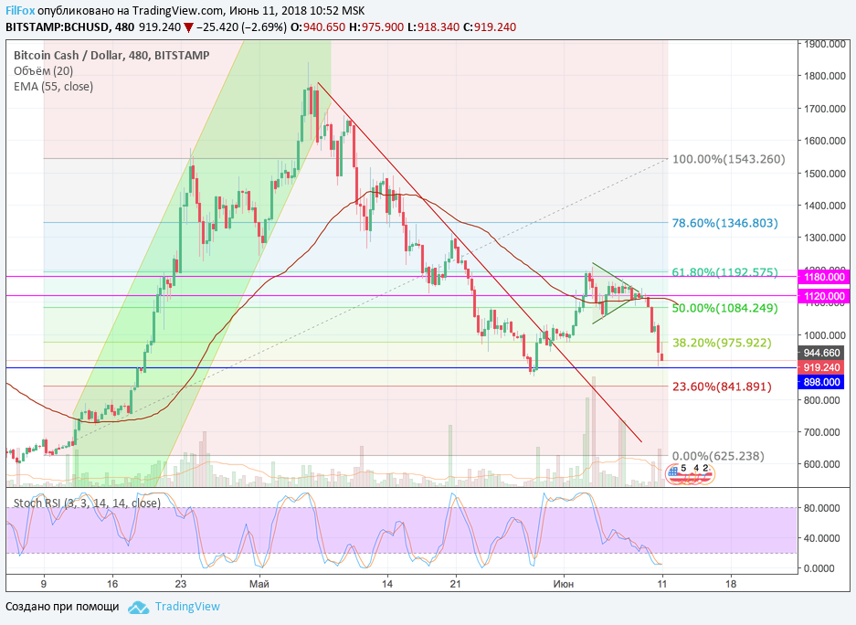 На выходных пара пробила целевой уровень поддержки 38.2% фибо (975.92 USD) и установила минимум в точке 900.00 USD. На отскоке пара пыталась восстановиться к пробитой поддержке 38.2% фибо (975.92 USD), но она уже выступала сопротивлением, поэтому сейчас цена консолидируется над уровнем 898.00 USD. Следующий уровень, где цена будет консолидироваться после ре-теста сопротивления и очередного снижения это 23.6% фибо (841.89 USD).